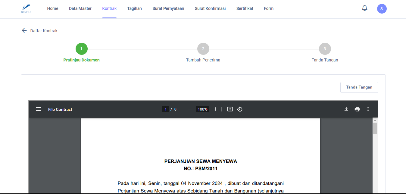 Selanjutnya penerima dokumen dapat menanda tangani dengan membuka Daftar Kontrak, lalu pilih "Kontrak yang diterima", kemudian melakukan tanda tangan.