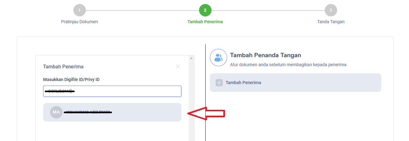 Kemudian masukkan Digifile ID pengguna yang akan menerima dokumen tersebut, apabila Digifile ID yang dimasukkan terdaftar akan muncul dibawahnya form input dan silahkan tekan pada nama penerima tersebut seperti berikut