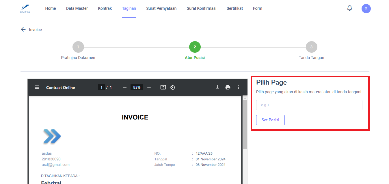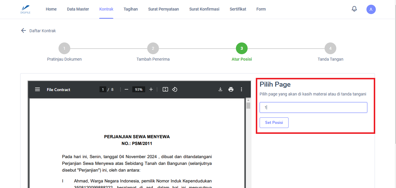 Selanjutnya silahkan masukkan nomor halaman untuk meletakkan tanda tangan, kemudian tekan tombol "Set Posisi".