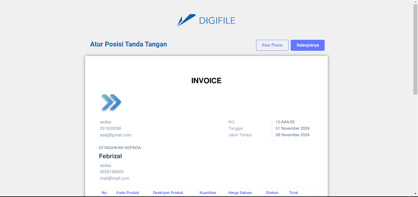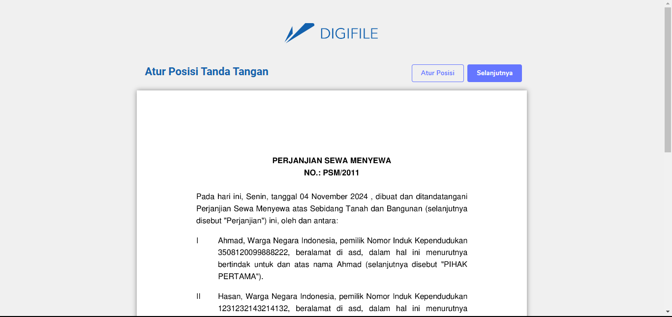Kemudian pada halaman ini silahkan mengatur letak tanda tangan dengan menekan tombol "Atur Posisi"
