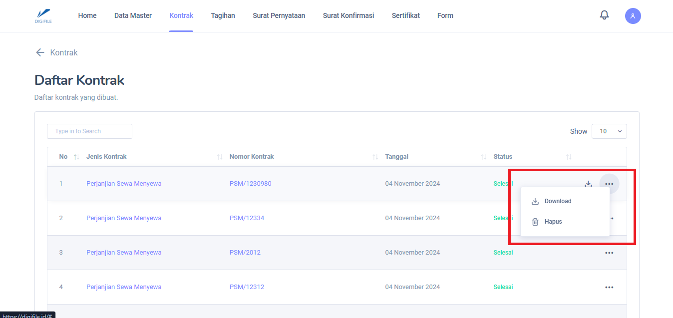 Proses Tanda Tangan dokumen sudah selesai, maka akan diarahkan ke halaman Daftar Kontrak. Jika status dokumen sudah selesai maka kedua belah pihak bisa mengunduh dokumen dengan menekan tombol "